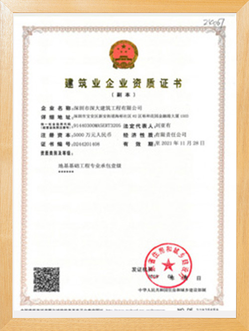 深圳市深大建筑工程有限公司,成立于2017年,注冊(cè)資本5000萬,總部位于深圳市寶安區(qū)中心地段。公司擁有地基基礎(chǔ)工程專業(yè)承包壹級(jí)資質(zhì),市政公用工程施工總承包二級(jí)資質(zhì),是一家一體化現(xiàn)代型企業(yè)。公司重視企業(yè)內(nèi)部管理與發(fā)展,嚴(yán)格實(shí)施ISO管理體系,率先通過了ISO9001質(zhì)量管理體系認(rèn)證、環(huán)境管理體系及、職業(yè)健康安全管理體系的認(rèn)證。為公司的長(zhǎng)遠(yuǎn)發(fā)展奠定了穩(wěn)健基礎(chǔ)。